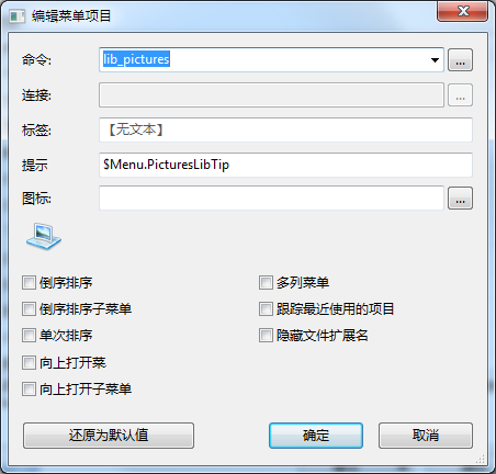在这里你可以选择一个命令的项目,其文本、图标和其他属性。按 恢复默认值 按钮来得到默认的文本和图标选择命令.