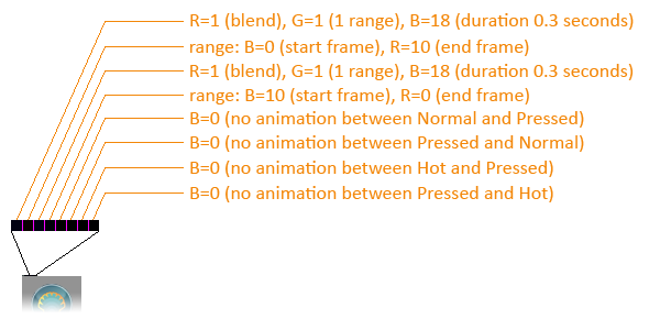 The animated image consists of one or more rows of pixels that describe the animation, followed by one or more button frames. The description rows need to be fully opaque (A=255). The frames are counted from 0 – frame0, frame1, .... All frames must be the same size.